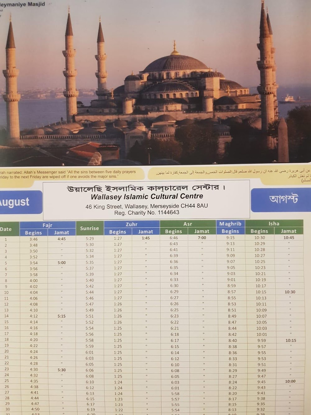 20:08. 21:43. Prayer times of july Prayer times of september. Find all information about this mosque : Islamic cultural centre and al-rahma mosque, 29 Hatherley St, Liverpool, Merseyside L8, UK.