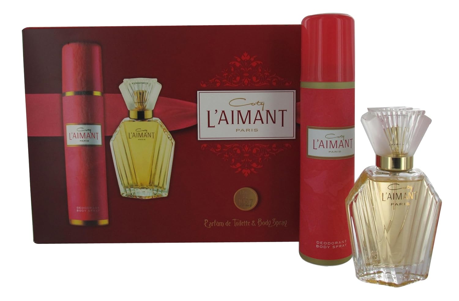 About this item . Coty L'Aimant Gift Set 1.0oz (30ml) Parfum de Toilette + 2.5oz (75ml) Body Spray ; Coty L'Aimant Gift Set 1.0oz (30ml) Parfum de Toilette + 2.5oz (75ml) Body Spray