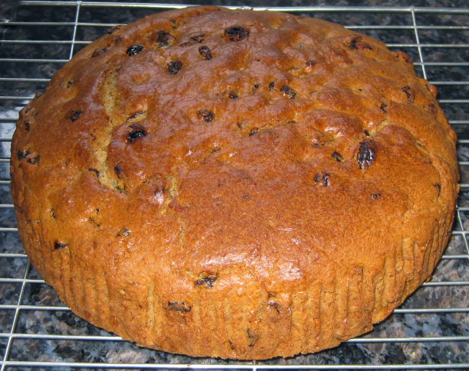 1 tsp vanilla. Grease and flour, or grease and line, two 1lb loaf tins. Sieve the dry ingredients together into a bowl. Cut in the marg with a fork, then add the raisins. Weigh the liquid and add the vanilla to it. Pour the liquid into the bowl with the other ingredients, then crack the eggs one at a time into the measuring cup and then add to.