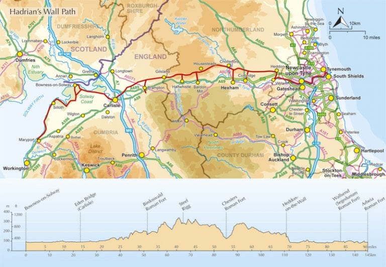 Look out for the symbol: this itinerary covers the entire Hadrian's Wall Path from Wallsend (Newcastle) to Bowness-on-Solway. Average Hiking Distance: 22-23km (13.5-14.5 miles) per day Average Hiking Time: 5-8 hours per day. Route of Hadrian's Wall Path National Trail and overnight locations for Hillwalk Tours' walking holidays.