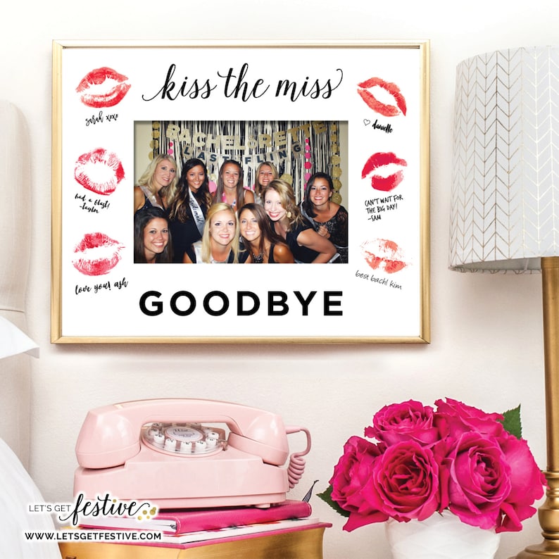 Take a look: there are a few kiss prints to choose from and we like all of the styles. I especially love the kiss the miss goodbye photo frame where you can include a favorite picture from the party. Enjoy! Kiss the Miss Goodbye Print. Kiss the Miss Goodbye Picture Frame. This picture frame is a beautiful and colorful option! By GoldandGlamour.