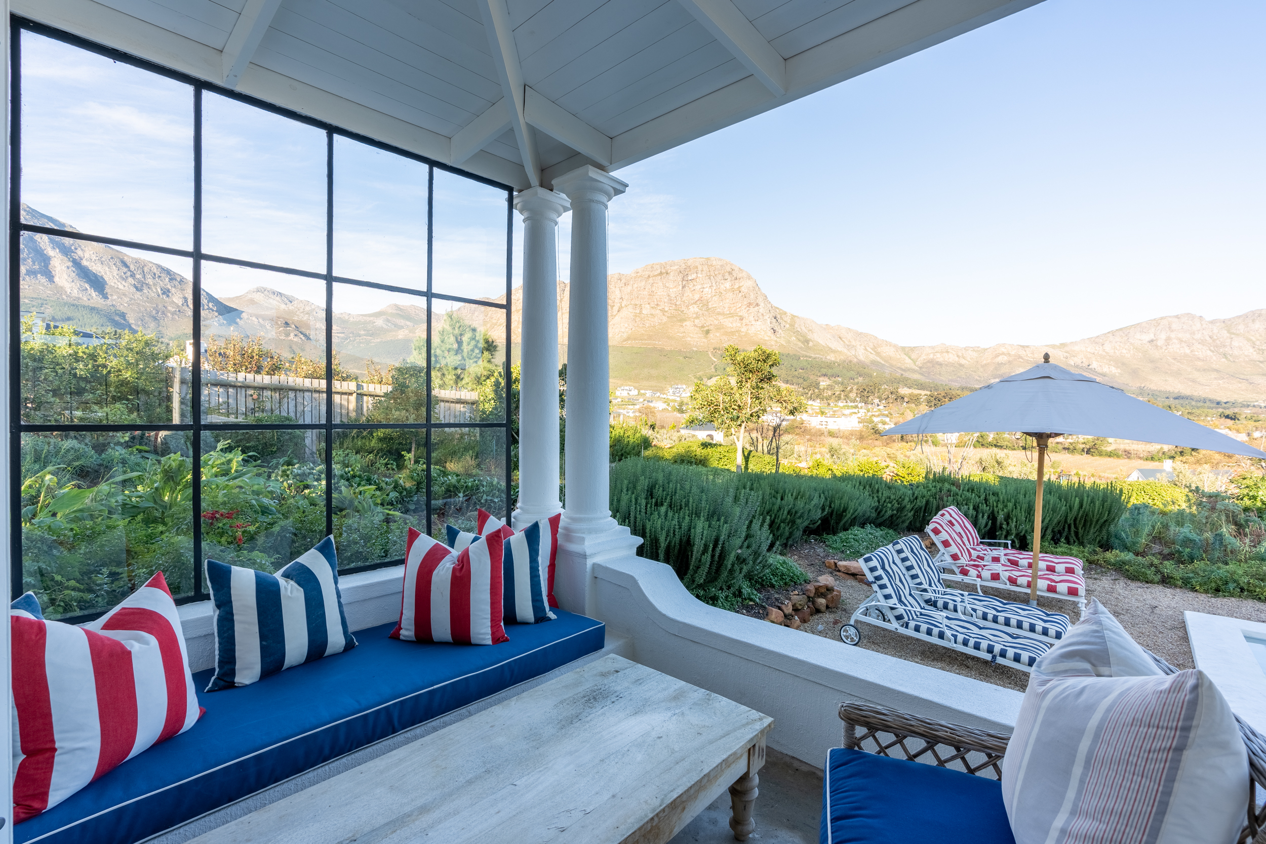 La Cotte Orchard Cottages. Erf No. 550 Upper Uitkyk Street, 7690 Franschhoek, Zuid-Afrika - Uitstekende locatie - toon op kaart. De prachtige ligging. Het terras en het zwembad. Gezellige woonkamer en slaapkamers, mooie badkamers. Het huisje is sfeervol, luxe maar toch huiselijk met veel gevoel voor detail ingericht.