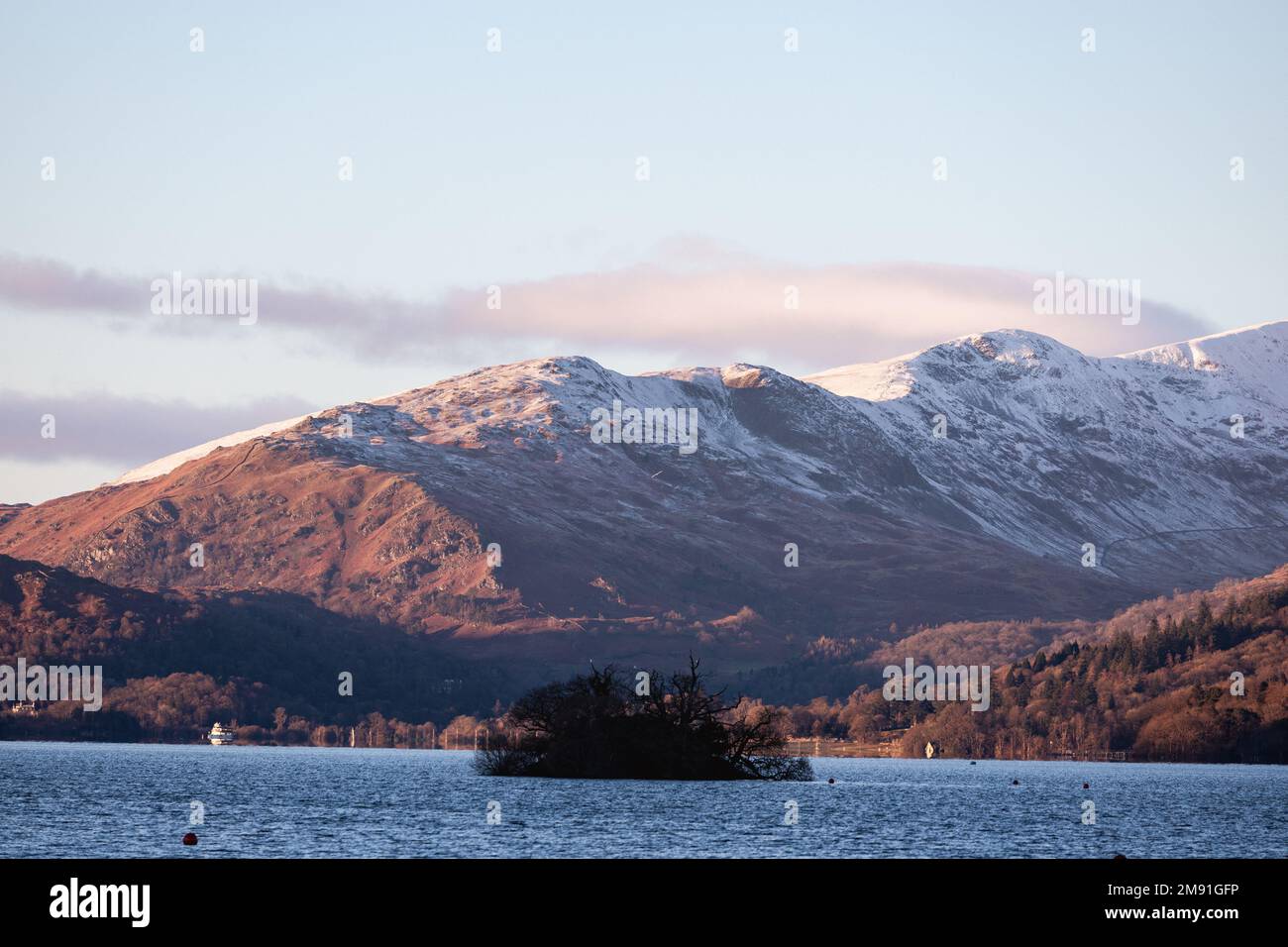 Lake Windermere Cumbria 16th January 2023 .UK Weather Last of the days sun on the snow covered